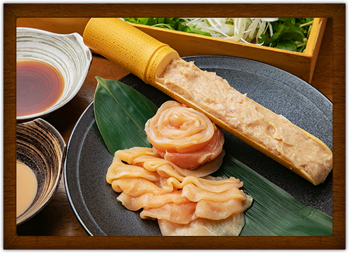 「特製鶏白湯スープ」で「紀州銘柄鳥 ムネ肉」を軽くしゃぶしゃぶして頂き、「ポン酢」と「自家製胡麻だれ」で味わって頂く、さっぱりとした味わいのヘルシーなお料理です。